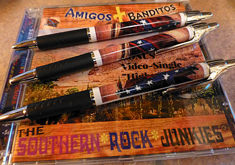 Der Kugelschreiber der Southern Rock Junkies ist aus weißem Kunststoff mit Aufdruck des AMIGOS-Logos als vier-farbiger Siebdruck. Die Fingerauflage ist aus schwarzem, gummiähnlichem Material, so dass der Kugelschreiber gut in der Hand liegt und sich angenehm anfühlt. Optisch ist der Kugelschreiber durch sein ansprechendes Design ein wirklicher "Hingucker". Die Großraum-Mine sorgt für ein langes Schreibvergnügen.
